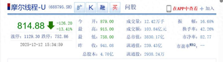 摩尔线程总股本4.7亿,本次发行7千万股,目前上市交易流通股2938.24万股。首日振幅115.51%;涨幅486.22%;换手率为85.49%;成交金额153.1亿。也就说,绝大部分首发申购的股民首日抛出,合计2512.01万股。如此高的价格,如此大的量,是谁在接盘?肯定不是散户,而是机构大量吃入。